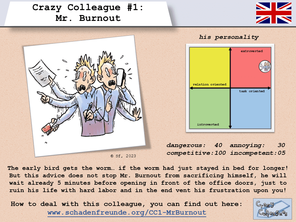 Es ist immer gut, jemanden im Arbeitsteam zu haben, der mit Herzblut bei der Sache ist und sich richtig für sie ins Zeug legt. Aber wie dir das Beispiel von Hans hoffentlich verdeutlicht hat, ist der Mr. Burn-Out ein entzündeter Neujahrsböller, bei dem die Lunte schon im Inneren verschwunden ist und der jeden Moment hochgehen kann. In seiner Nähe kann es dann einen ganz schönen Knall geben, ohne dass Du etwas dazu könntest. Doch es muss gar nicht erst zur Explosion kommen. Schon seine nervöse Gegenwart ist ansteckend und kann leicht auf dich und andere überspringen. Egal ob er in dir Mitleid oder Unbehagen hervorruft, sein ständig vibrierendes Bein, das Erdbeben im unteren bis mittleren Bereich der Richterskala auf dem Schreibtisch verursacht, ist eine störende Ablenkung für diejenigen, die mit ihm arbeiten müssen. Hinzu kommt, dass seine Ruhelosigkeit das Tempo in eurer Gruppe diktieren wird. Es ist unmöglich die Arbeit ruhig und geordnet anzugehen, wenn seine Lunte entzündet ist und er ungebremst in jeder Angelegenheit nach vorne prescht. Wie bekommst du diesen Kollegen in den Griff, ohne dass seine Unruhe auf dich und deine Gruppe übergreift?